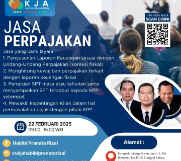 JASA PERPAJAKAN !KJA Kantor Jasa Akuntan & Kantor Konsultan PajakJumat, 9 Mei 2025Adapun jasa yang kami layani: 1. Penyusunan Laporan Keuangan sesuai dengan Undang- Undang Perpajakan (koreksi fiskal) 2. Menghitung kewajiban perpajakan ... Read More